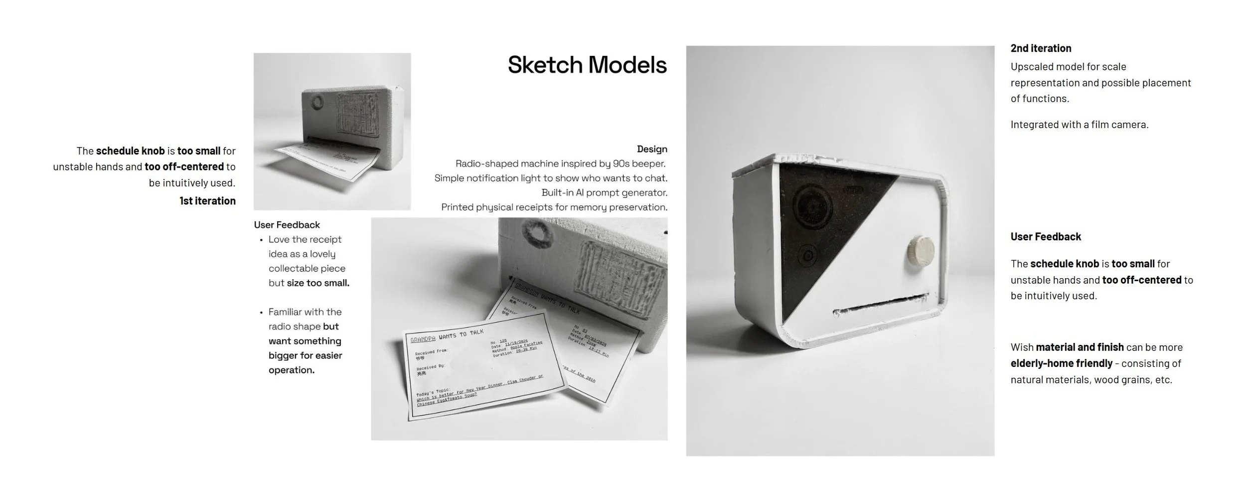 Idea brainstorming - presented to senior interviewees for opinion feedback. Three products that fit seniors’ past product experiences - radio, beeper, and receipt printer - took the most liking from the interviewees and served as a source of inspiration.